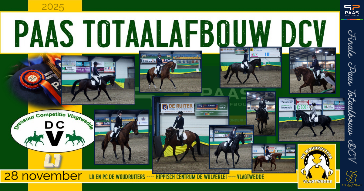 Vrijdagavond 28 november vond bij LR & PC De Woudruiters in Vlagtwedde de finale van de Paas Totaalafbouw DCV plaats. Tijdens deze avond kwamen onder andere de combinaties in de L1-klasse aan de start. De sfeer was sportief en de deelnemers reden sterke en verzorgde proeven.