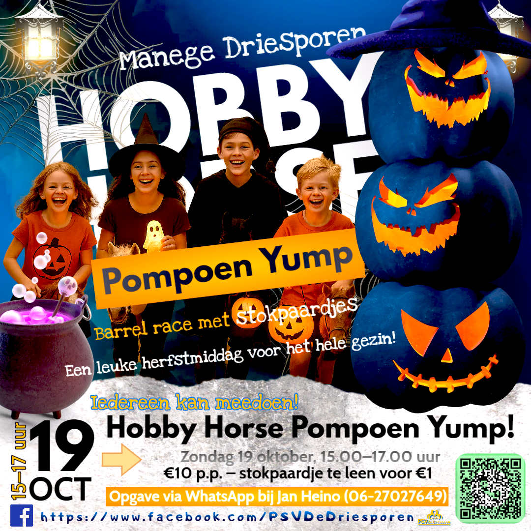 Op zondag 19 oktober wordt bij Manege Driesporen de Hobby Horse Pompoen Yump georganiseerd. Het evenement vindt plaats van 15.00 tot 17.00 uur en staat in het teken van sport en recreatie met stokpaardjes.