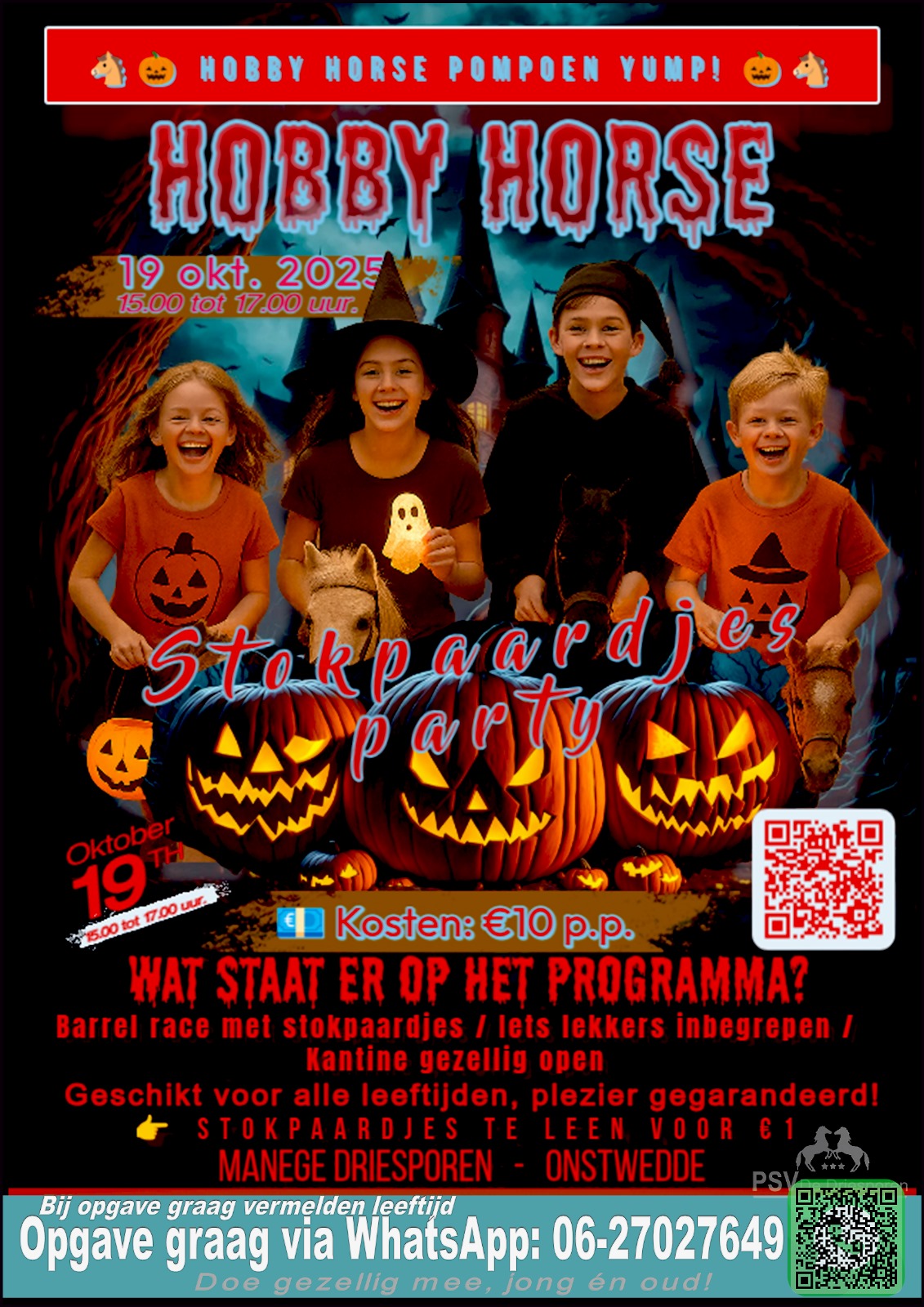 Op zondag 19 oktober wordt bij Manege Driesporen de Hobby Horse Pompoen Yump georganiseerd. Het evenement vindt plaats van 15.00 tot 17.00 uur en staat in het teken van sport en recreatie met stokpaardjes.