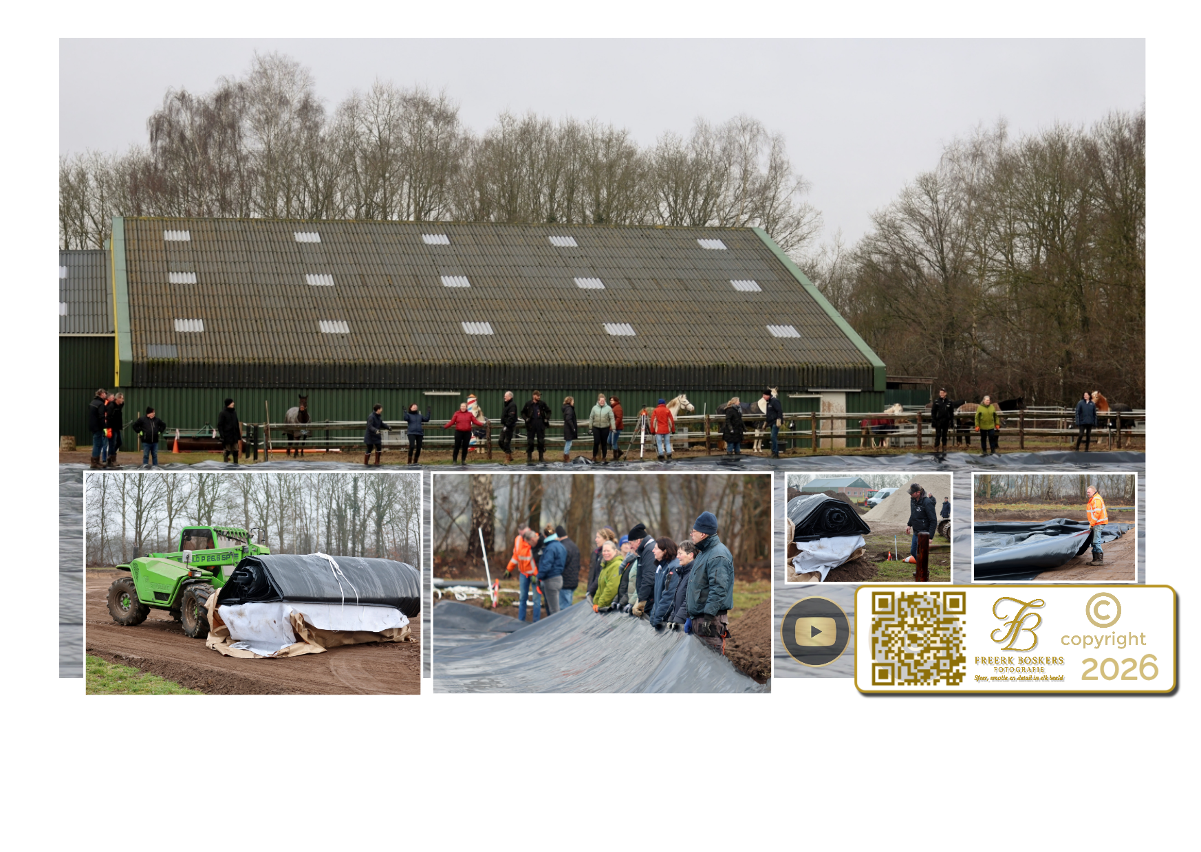 ONSTWEDDE – 10 februari 2026 – Bij Manege De Driesporen is dinsdagmorgen een belangrijke stap gezet in de aanleg van de nieuwe buitenbak. Met hulp van een grote groep vrijwilligers werd het folie uitgerold dat onderdeel vormt van de bodemopbouw.